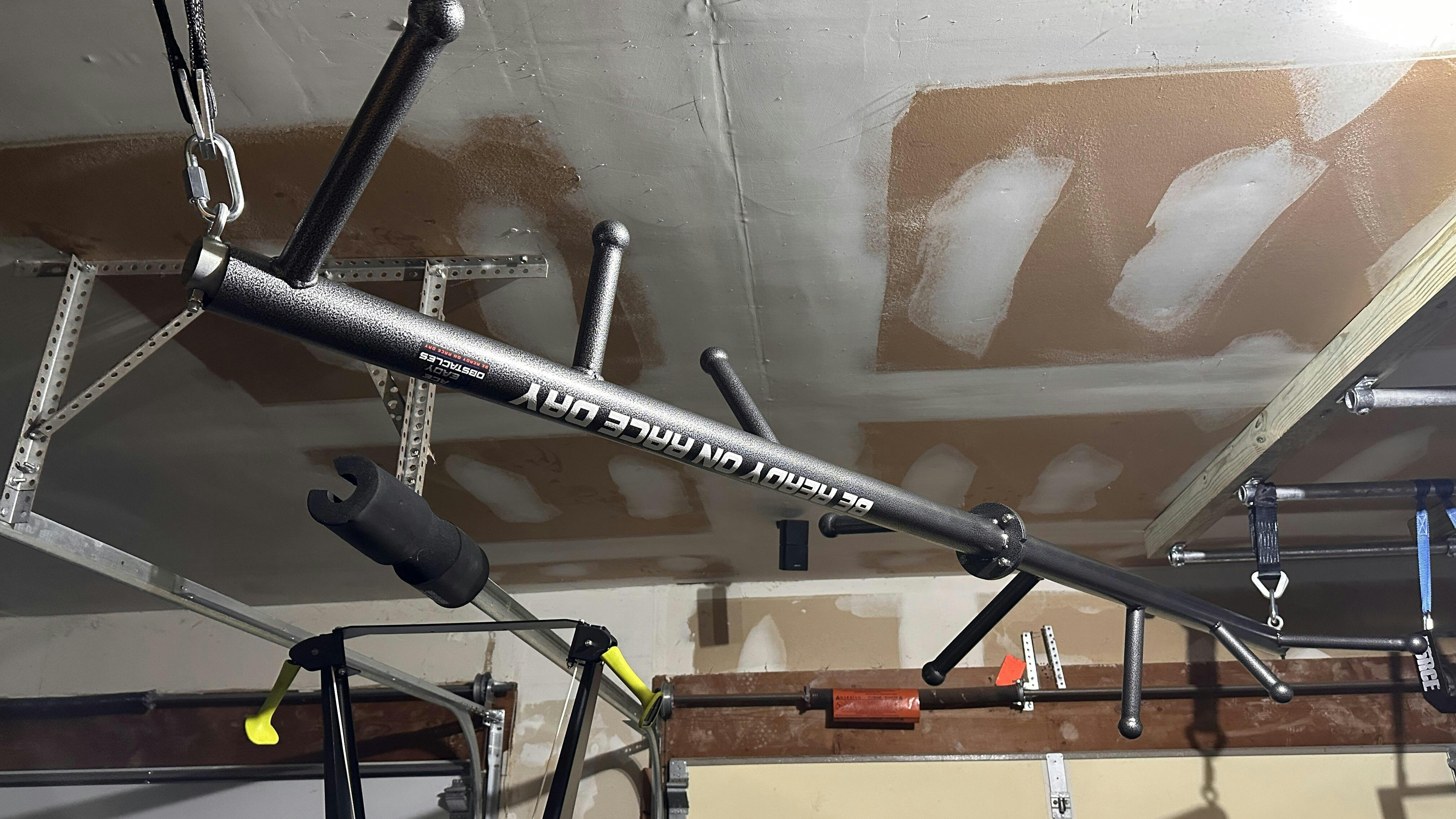 This thing is awesome! The first thing I noticed when this arrived was how well built it is - it’s super heavy duty and the construction and finish are flawless. It was easy to install too - just had to put up a couple eye bolts to hang it from - all the other hardware needed was provided. I keep all my OCR stuff in one place, but you could definitely take this to a playground or park if you were so inclined. Add a few rings, ropes, t-bars etc. to the front/back end and you could build a legit rig just about anywhere. It’s also worth mentioning that the mini Kraken is exactly like the ones featured in Frontline OCR, just a bit smaller and more portable. Definitely an epic addition to any OCR addict’s collection!